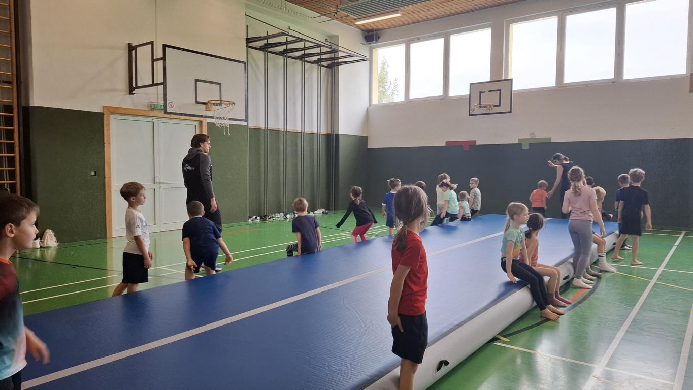 Im Turnsaal nutzten wir die coole Airtrack Matte, ein ganz besonderes Erlebnis! Außerdem werden wir in den nächsten Wochen in Bewegung und Sport von Briggi unterstützt, die mit den Kindern gymnastische Übungen macht.